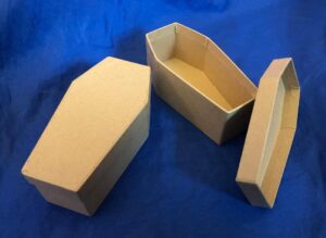 Cardboard coffins are used when you want to paint or decorate your coffin to make it more personal to you or the intended target. These coffins are approximately 4 inches long and roomy enough for petitions papers, photos, personal concerns, or hair and nail clippings to personalize your spell. Coffins are unded in graveyard work when someone wants to curse, junx, or cause other negative occurances on an intended person. Many variations of graveyard work exist in different cultures and we invite you to investigate to determine which method is best for your own situation. Some belief systems require you to bury the cardboard coffin in the area above a grave of a Police Officer, Fireman, Judge, or in some cases, someone who “did wrong” when living.